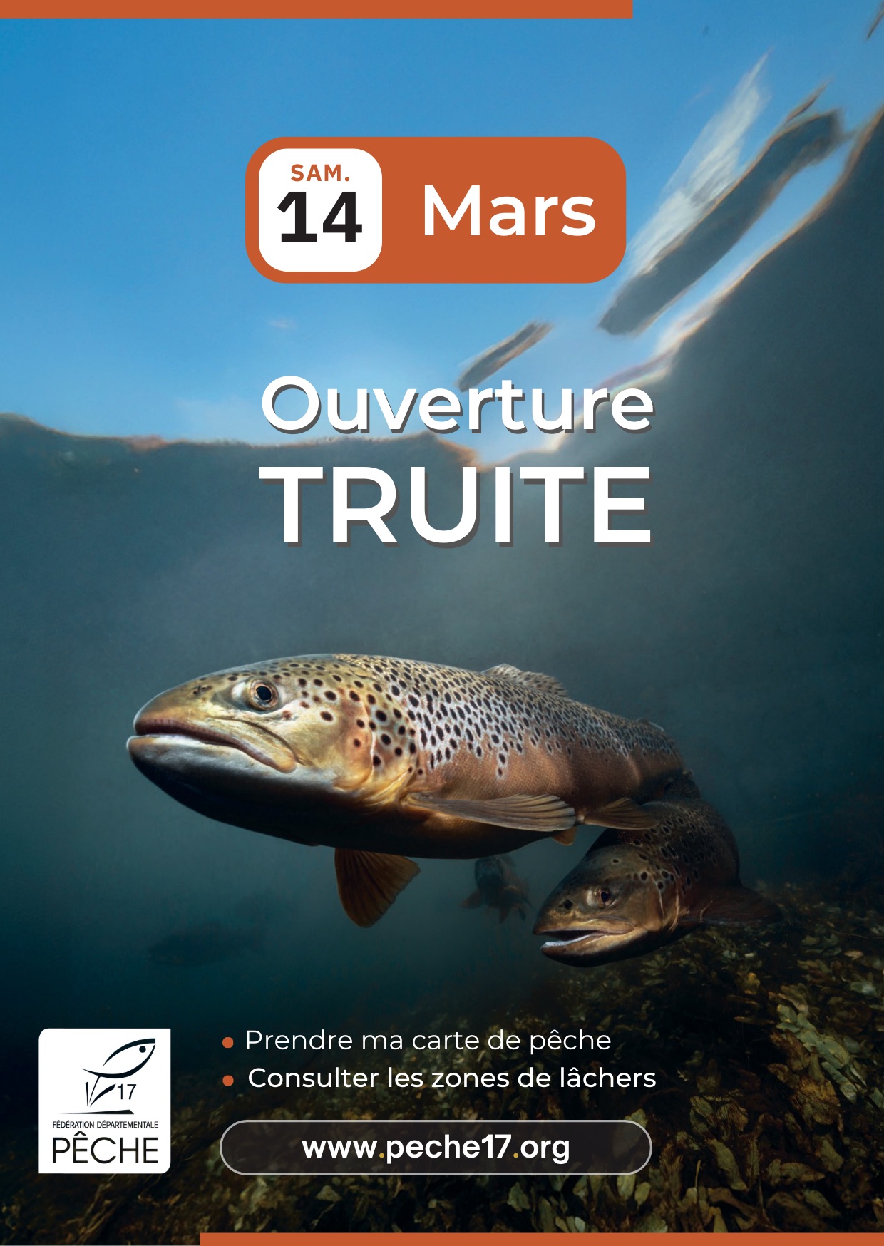 Ouverture de la truite par lagaulecharentaise17 | 25 Fév 2026 | Actualité Bonjour à tous, l’ ouverture de la pêche à la truite le SAMEDI 14 Mars 2026 à partir de 06h49, en 1re et 2e catégories piscicoles. Plus de renseignements sur le site de la fédération, notamment sur les lâchers ! https://www.peche17.org/
